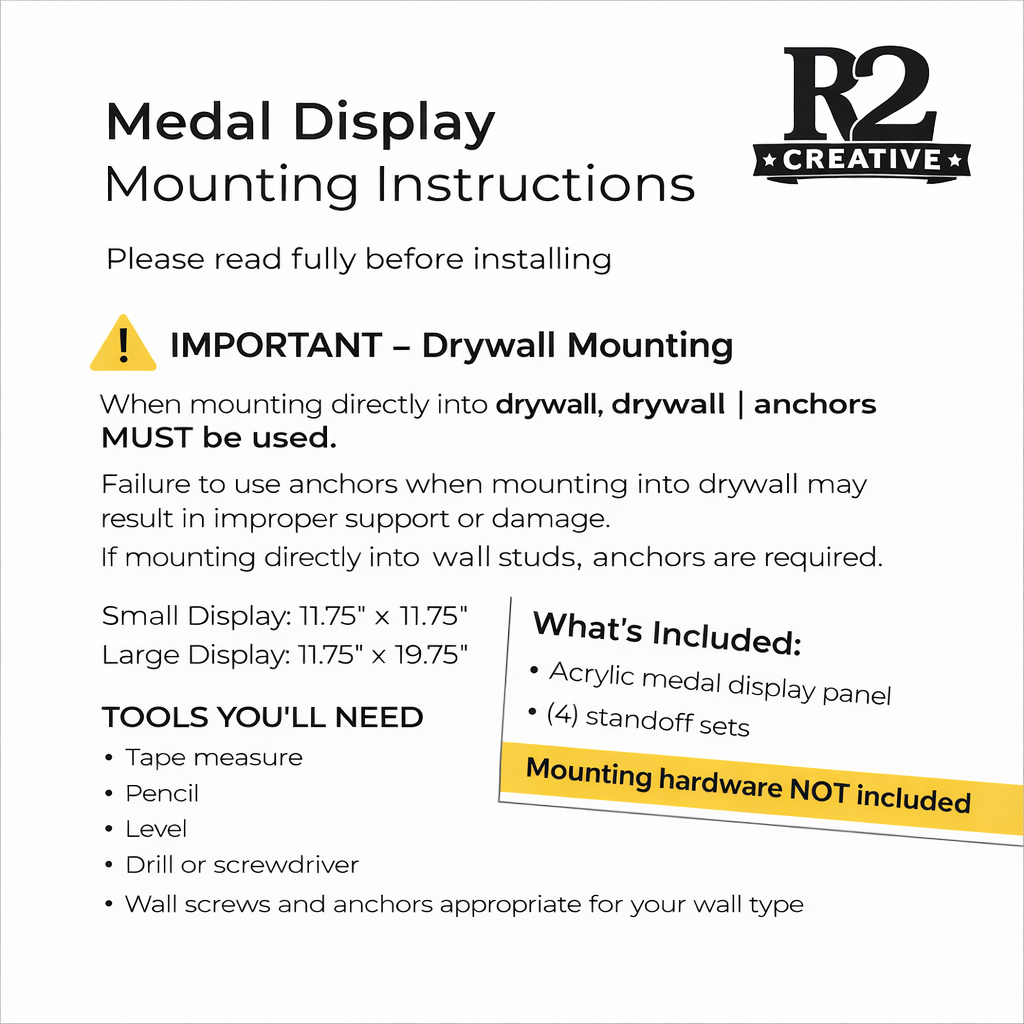 Two sizes are available. The Small display measures 11.75" wide by 11.75" tall and holds approximately 15–25 medals, depending on ribbon thickness. The Large display measures 11.75" tall by 19.75" wide, making it ideal for larger or growing medal collections.
