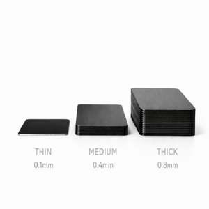 Cards measure 2.12″ x 3.38″ and are available in three thickness options: Thin at 0.1mm (0.01″), Medium at 0.4mm (0.02″), or Thick at 1mm (0.04″). The black aluminum shown offers a sleek, professional finish ideal for networking, client meetings, and branding.