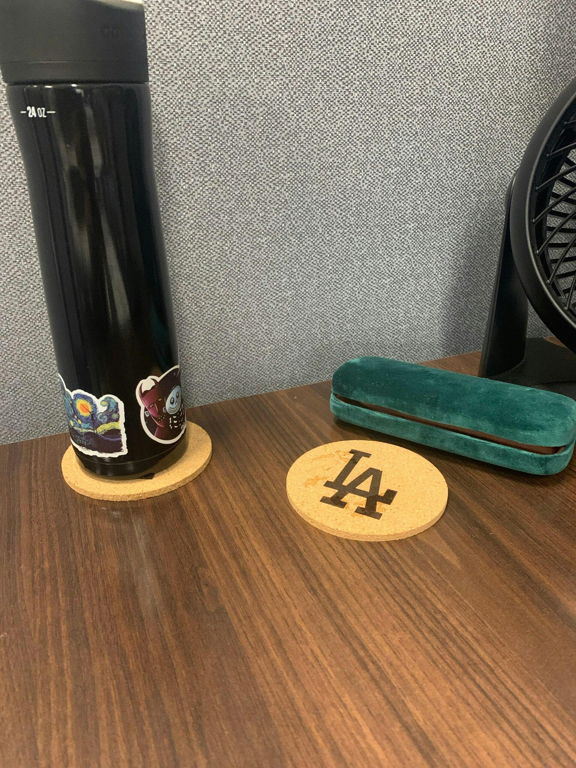 Each coaster is made from cork & laser-engraved for a sleek yet bold finish. These coasters measure about 3.95" round & 0.2" thick.